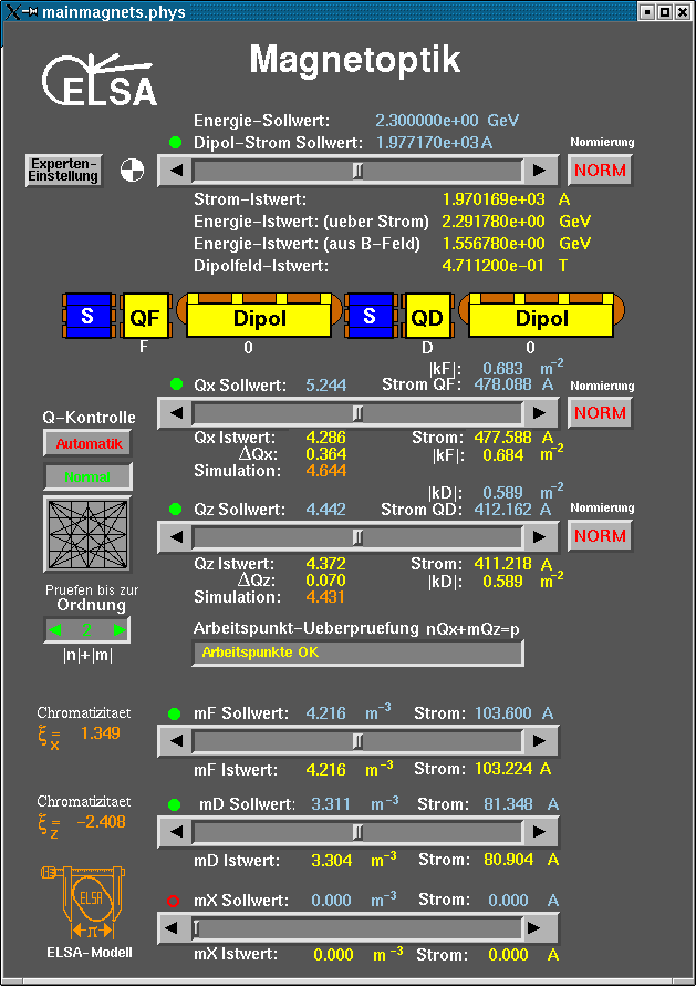 By the use of this menu, the beam optics of ELSA including the dipoles, two families of main quadrupoles and three families of sextupoles is controlled. Besides the controlled values (blue) and automatically updated measured values (yellow) also online calculated simulation data (orange) is presented in this menu.