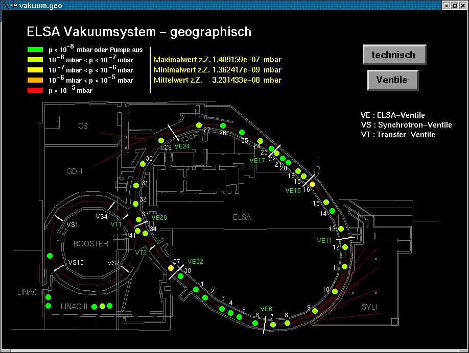 This menu shows the position of the vacuum pumps at the ELSA facility. Each pump is represented by a colored circle. The color of the circle depends on the vacuum at this point.